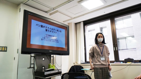 地域に根差した個人経営店やコミュニティカフェにて、「Smile Coupon」を通じて顧客・店舗・寄付先の人たちのリアルな笑顔を生み出すことを目指すアイデア。クーポン利用客は料理と自分の笑顔を写真撮影し店側に提供。また寄付者にはメールで支援先のこどもたちの笑顔を届けるアイデアを発表しました。