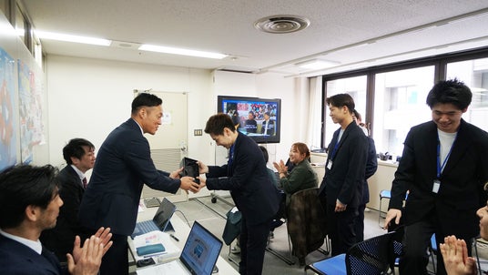 厳正なる審査の結果、1班が優秀賞に選ばれトロフィーが授与されました。審査員を務めた清水社長からは参加した学生に向けて、「ゼロからイチを作る場合は頭で考えることも大事だが、とにかく行動することが大事。失敗の数を集めて成功につなげていってほしい」とエールが送られました。