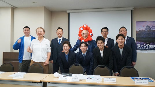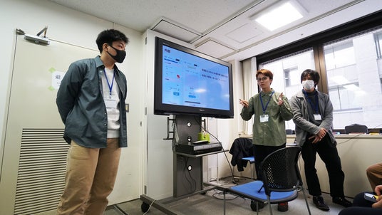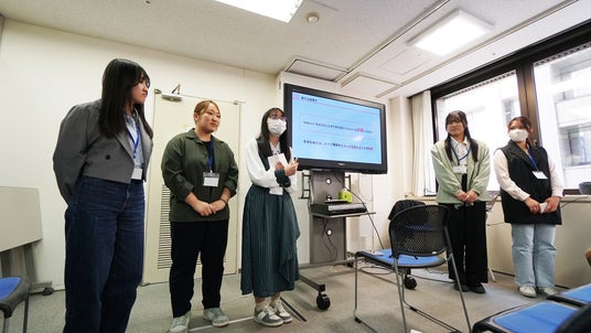 発表会の後に行われた記者会見では、開催間近となった大阪・関西万博を見据え、「Smile Coupon」事業紹介のほか、大阪・関西万博での掲出などについての発表が行われ、優秀賞を受賞した1班の学生たちも参加しました。