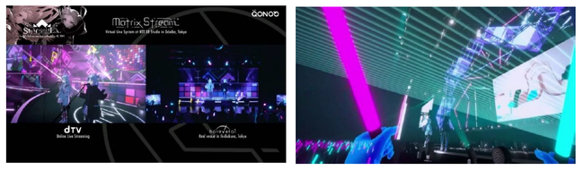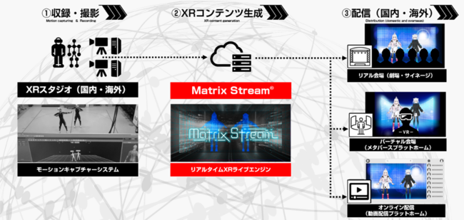 本システムは、XRスタジオのモーションキャプチャなど、演者のデータをリアルタイムにバーチャル空間上のキャラクターの動きとして生成し、XRによる音楽ライブや番組などを、リアル会場のスクリーンへの配信、VR配信、スマートフォンなどに向けたオンライン配信など、リアルタイムに配信することが可能です。