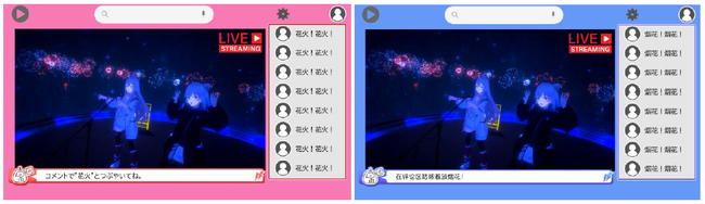 配信サイトの「コメント」や「投げ銭」などの機能と連携することで、バーチャル空間の演出をインタラクティブに行えます。例えば、日本と中国の動画配信サイトにバーチャルライブを同時生配信してそれぞれの言語で応援コメントを入れると、リアルタイムに花火が打ち上がるなど、さまざまな国の人が参加しながらライブを楽しむことが可能です。また演出表現は、コンテンツの世界観に合わせて柔軟な対応が可能です。