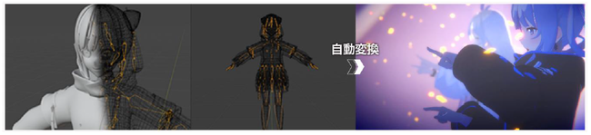 一般的なXRライブシステムでは、利用するシステムごとにセットアップを行いキャラクターモデルを修正・調整する必要がある場合もあります。本システムでは自社・他社を問わず、バーチャルキャラクターモデル導入におけるデータ構造を最適化するツールを開発し、従来は手動で行われていたアバターモデル形式からの変換を自動化します。