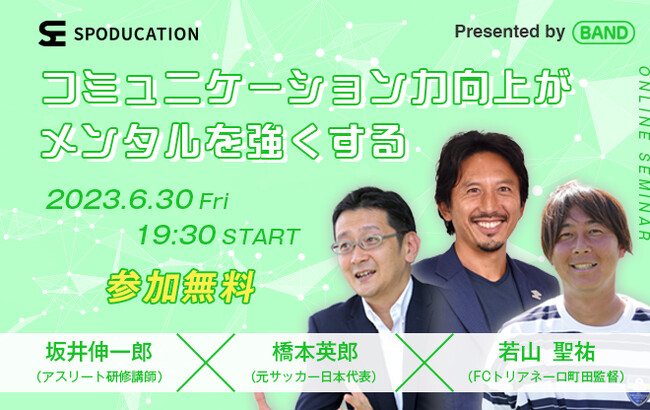 無料グループコミュニケーションサービス「BAND」は、「スポーツ×教育」による人材育成を目指すウェブサービス「SPODUCATION(スポデュケーション)」とリーダーの役たつコミュニケーションに関する無料オンラインセミナーを開催しています。今回は「コミュニケーション力向上がメンタルを強くする」というテーマで第3回目のセミナーを開催することとなりましたので、お知らせします。