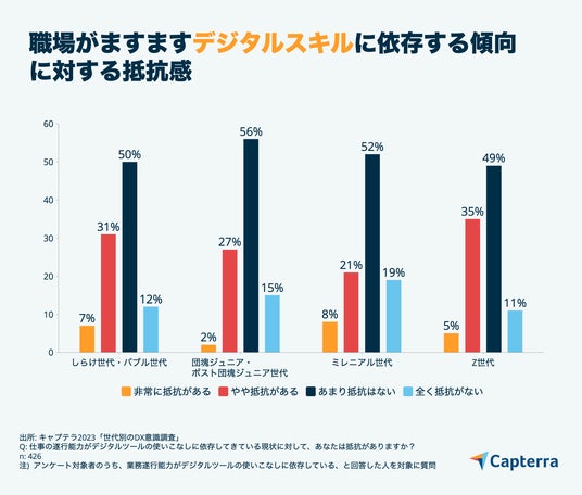Q.「仕事の遂行能力がデジタルツールの使いこなしに依存してきている現状に対して、あなたは抵抗がありますか?」