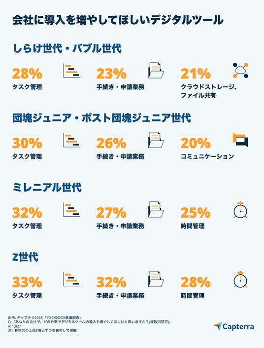 SaaS比較サイトキャプテラはこの度、全国の企業に勤める1,027名に、世代別のDX意識調査を行い、各世代が感じているデジタルツールの利点と課題をまとめました。