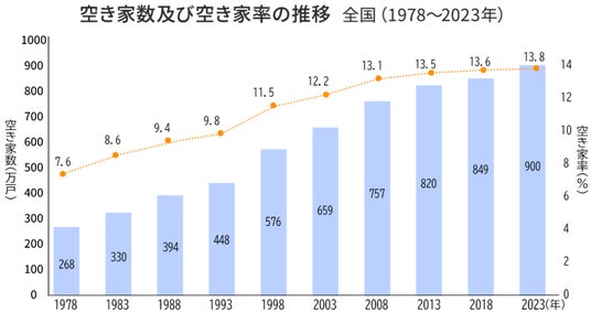 総務省「令和5年住宅・土地統計調査」によると、2023年時点の空き家率は13.8%と過去最高を記録。空き家数は約900万戸と過去最多、2018年から51万戸の増加となりました。