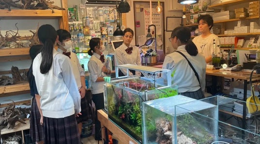 アクアリウムショップで指導を受ける学生たち