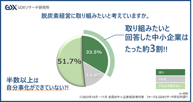 Green(グリーン)とDigital(デジタル)を活用した中小企業の変革を目指すフォーバルGDXリサーチ研究所(本社:東京都渋谷区、所長:平良学)は、中小企業の経営者600人に「中小企業の脱炭素経営に関する実態調査」を実施しました。