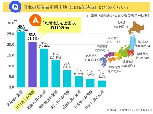 正解は九州地方を上回る約410万haもの土地が、所有者不明となっているのです。正答率は21.2%、5人に1人が把握していたことになります。