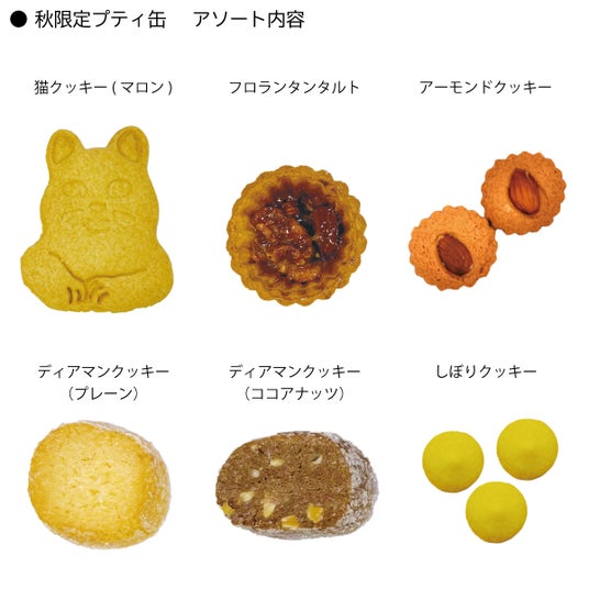 可愛らしい猫たちが描かれた缶の中に秋限定のフロランタンタルトなど、6種のクッキーを詰め合わせました。