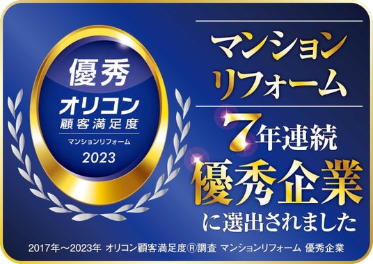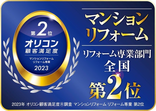 弊社は日頃より、お客様満足度向上に向けて様々な取り組みを行っており、口コミによるご紹介をいただく機会も増え、その結果、2023年度の「オリコン顧客満足度調査」におきまして、「マンションリフォーム リフォーム専業部門」で全国第2位を獲得し、7年連続で「マンションリフォーム優秀企業」に選出されました。
