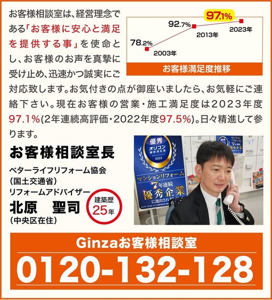 水回りを中心に住宅リフォームを手掛ける株式会社Ginza(本社:東京都中央区/代表取締役社長:池田馨)は、2023年度のお客様満足度(※当社調べ)が、97.1%を記録し、2年連続で97%台の高評価となりました。
