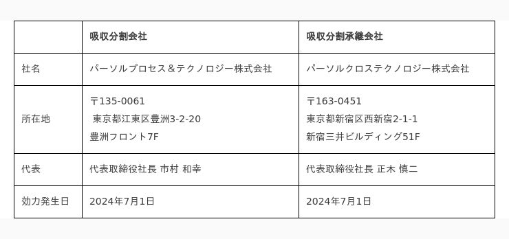本吸収分割は、パーソルクロステクノロジー株式会社を吸収分割継承会社とし、パーソルプロセス&テクノロジー株式会社を吸収分割会社とする吸収分割です。なお、本吸収分割の契約締結日は2024年5月17日となります。