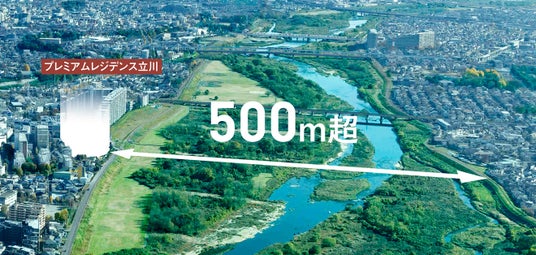 本プロジェクトは、多彩な商業店舗が集積する立川エリアでありながらリバーフロントの最前列という、都市利便性と水辺に代表される自然環境を兼ね備えた希少な立地に誕生します。 敷地南側に広がる多摩川の河川敷は対岸まで約500mにわたり視界を遮る建物が無く、開放感あふれる眺望を享受できるロケーションとなります。
