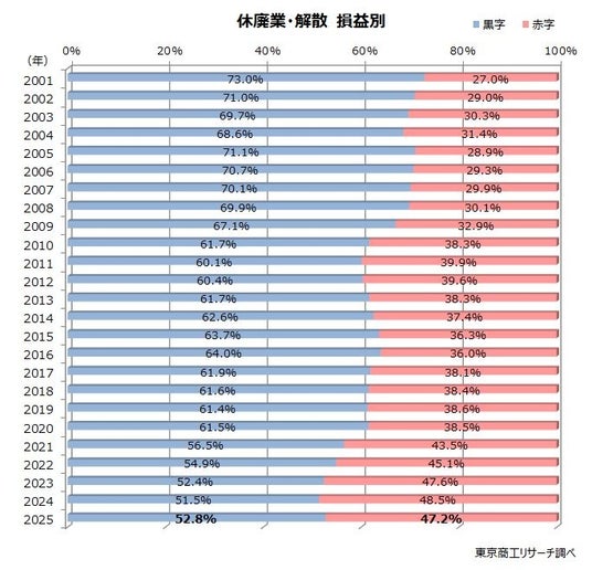 2025年は損益(最終利益)が黒字の企業率は52.8%(前年比1.3ポイント増)、赤字率は47.2%だった。