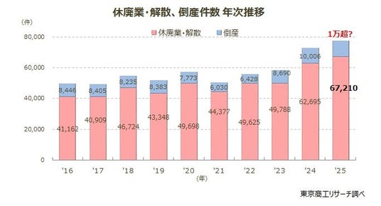 2025年の「休廃業・解散」企業は6万7,210件(前年比7.2%増)で、過去最多を記録した。企業倒産は1万件超の公算で、倒産と休廃業・解散を合わせた市場からの「退出企業」は7万7,000件台と過去最多の見込みだ。