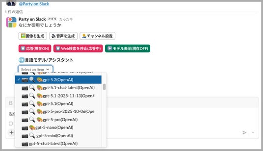 Slackで「@Party on Slack」をメンションすると、モデルを選択し生成AIと会話ができる