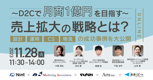 ECサイトの運営代行サービスを提供しているマーケティングアソシエーション株式会社(本社:東京都台東区 代表取締役:中園広和、以下当社)は、2023年11月28日(火)に、ウェブセミナー『~D2Cで月商1億円を目指す~ 売上拡大の戦略とは? 設計・運用・CS・物流の成功事例を大公開』を、株式会社Nint様、サヴァリ株式会社様、株式会社ネットショップ支援室様、株式会社Arts様と共催いたします。