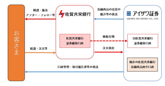 - お客さまとの接点となるフロント業務(勧誘、販売、アフター・フォロー等)は、引き続き、佐賀共栄銀行が担い、口座管理や取引報告書の発送等バック業務は当社が担います。