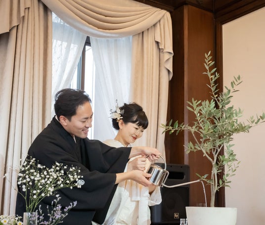 【植樹のセレモニー】 ゲストには土を入れてもらい、新郎新婦様が水を注ぐ演出です。植樹をする樹種によって、お2人の個性を表現することができます。「幸せな家族を新しく作り上げていく」「ゲストの平和を願う」という2つの意味が込められています。結婚式で創り上げた思い出を形として残し、記念として長い年月にわたり育成される木を見守ることができるセレモニーです。
