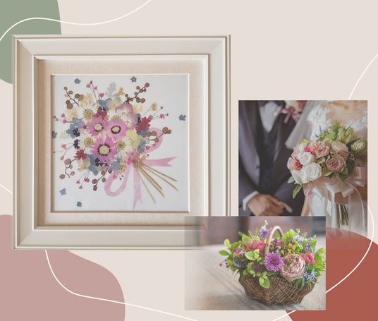 【アフターブーケ】 特別な想い出のお花を形に残すことのできるアフターブーケ。生花を「プレスフラワー(押し花)」や「ドライフラワー」に保存加工することで、フラワーロスの削減に繋がります。こだわりと想いが詰まったウエディングブーケを形に残し一輪でも廃棄されるお花を減らします。