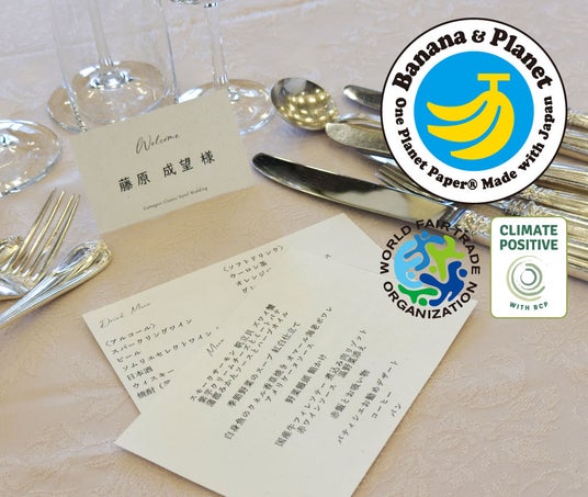 【バナナペーパーの活用】 ザンビアで今まで捨てられていたバナナの茎をアップサイクルして繊維を取り出し森林認証のバージンパルプを用いて日本の和紙の技術で作られています。「SDGs」の17目標すべてに繋がる、人にも環境にも優しい用紙です。少しクリームがかった色合いで、紙全体に繊維の粒が広がる、あたたかみのある自然な風合いが特徴です。