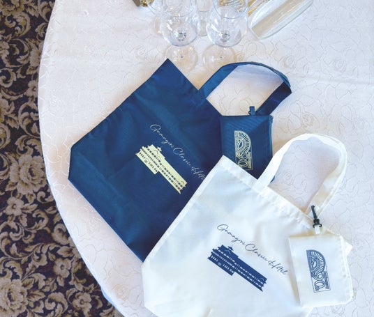 【引出物バッグ】 紙袋の代わりに、繰り返し使える蒲郡クラシックホテルオリジナルのエコバッグをご用意しております。ホワイトとネイビーの2色展開の為、テーブルコーディネートやお好みで色を選択することが可能です。本体を折りたたんで収納できるポーチもついておりますので、普段使いしやすいエコバッグとなります。