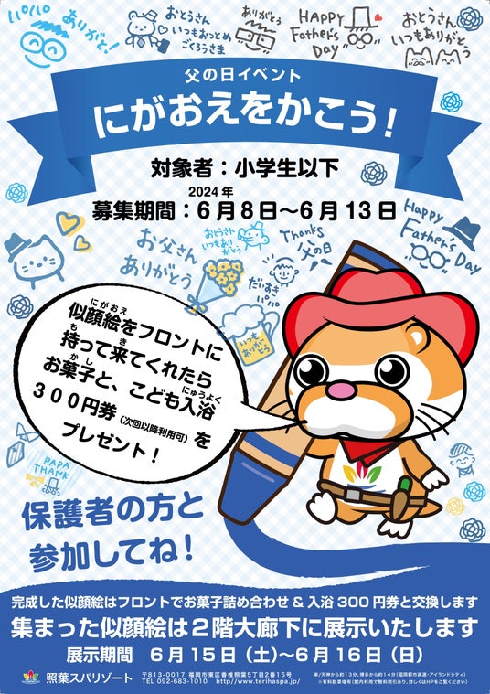 九州最大級の温浴複合施設「照葉スパリゾート本店」は父の日特別イベントとして6月8日(土)~6月13日(金)の期間に「父の日似顔絵イベント」を、2024年6月16日(日)には「バスボム作り体験」(限定50組)を開催いたします。「バスボム作り体験」はご希望者には作成したバスボムと一緒にチェキでの撮影サービス(1組1枚)も行います。