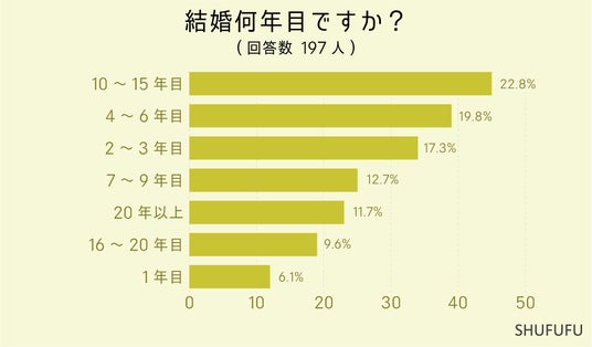 結婚何年目ですか?の問いに対して最も多かったのが「10~15年目(22.8%)」でした。 次いで「4~6年目(19.8%)」「2~3年目(17.3%)」という結果でした。 今回のアンケート調査では新婚の方の回答は少なめでした。