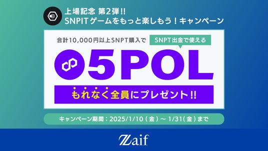 スナップイットトークン(SNPT)のZaif上場を記念して、期間中に合計10,000円以上のSNPTを購入で5POLプレゼントキャンペーンを開催いたします。
