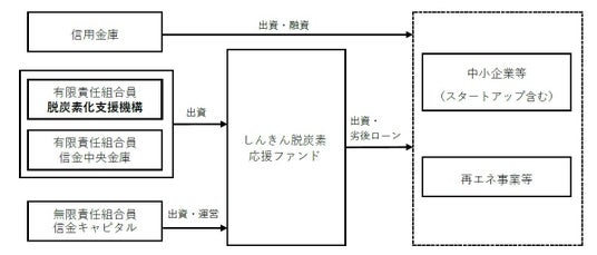 株式会社脱炭素化支援機構(代表取締役社長:田吉禎彦、英語名称:Japan Green Investment Corp. for Carbon Neutrality(JICN))は、信金中央金庫(本店:東京都中央区、理事長:柴田弘之)及び信金キャピタル株式会社(本社:東京都中央区、代表取締役社長:鈴木 存)と連携して設立した投資事業有限責任組合しんきん脱炭素応援ファンド(以下、「本ファンド」)に対して出資することを決定いたしました。