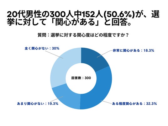 20代男性の300人を対象とした「選挙に対する関心度はどの程度ですか?」というアンケートで152人(50.6%)が「選挙について関心あり」という結果になりました。