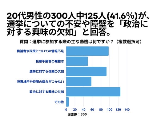 20代男性の300人を対象とした「選挙に対して感じている不安や障壁は何ですか?」というアンケートで125人(41.6%)が「政治に対する興味の欠如」という結果になりました。