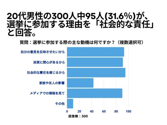 20代男性の300人を対象とした「選挙に参加する際の主な動機は何ですか?」というアンケートで95人(31.6%)が「社会的な責任」という結果になりました。