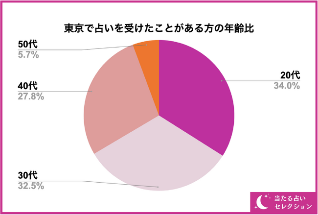 続いて、東京で占いを受けたことがある方の年齢比率ですが、画像の通り、20代~40代がメインとなっています。中でも、20代の利用者数が全体の33%と多くなっています。東京の立地上、若い人もお出かけついでに占いをお願いする人が多いのかもしれません。