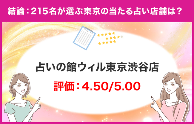 結論:ユーザーが選ぶ東京でおすすめの占い店舗は「占いの館ウィル東京渋谷店」「羅心盤 北千住店」