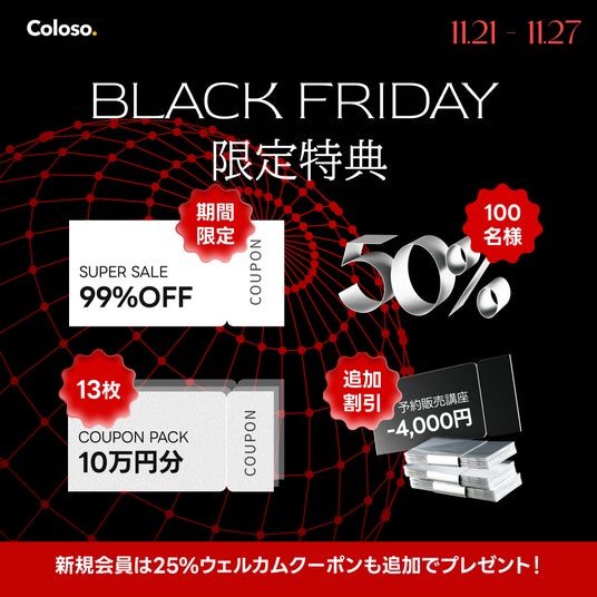 株式会社Day1 Company Japanが展開するオンライン教育プラットフォーム「Coloso」が、年に一度だけのBIG SALEイベントのBLACK FRIDAYを11月21日(木)から11月27日(水)まで7日間開始します。