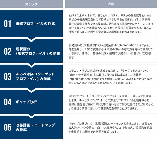 組織の現状に合わせたサイバーセキュリティ対策を計画・実施し改善していくためには、現状評価を行い、あるべき姿とのギャップを明確にすることが重要となります。