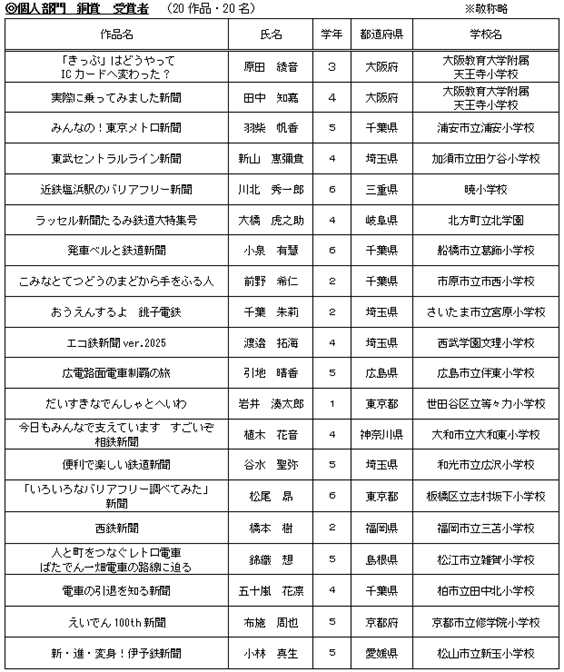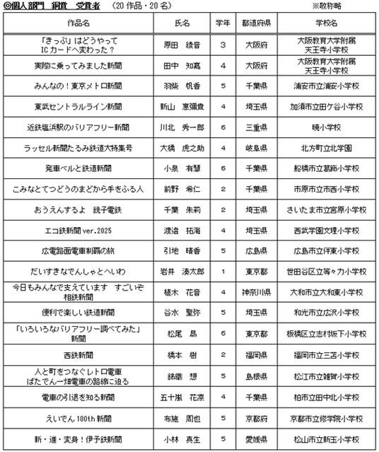 一般社団法人日本民営鉄道協会(事務局:東京都千代田区、会長:杉山健博)は、新聞作りを通じて子どもたちに鉄道に対する関心と理解を深めてもらうことを目的に、第19回「私とみんてつ」小学生新聞コンクールを開催し、このたび、3,099点の応募作品の中から厳正な審査を経て計100作品の受賞者と計41校の受賞校が決定しました。