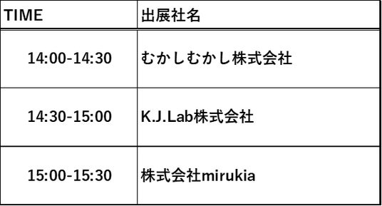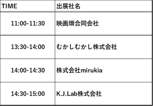 TCICパビリオン内に特設のイベントステージを設け、TCIC入居企業や支援先企業によるプレゼンテーションやデモンストレーションを実施いたします。以下のタイムテーブルで開催予定ですので、パビリオンにお立ち寄りの際はぜひご覧ください。