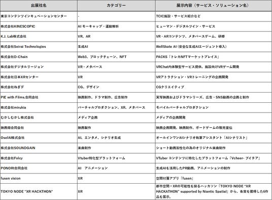 TCICは「TOKYO DIGICONX」にて、「TCICパビリオン」を出展します。TCICおよびコンテンツ領域で活躍されているTCIC入居企業、コワーキング利用15社、他支援先企業2社の計17社が共同出展となります。また、パビリオンの一画にミニステージを設け、共同出展社のプレゼンテーションやデモンストレーションを実施する予定です。