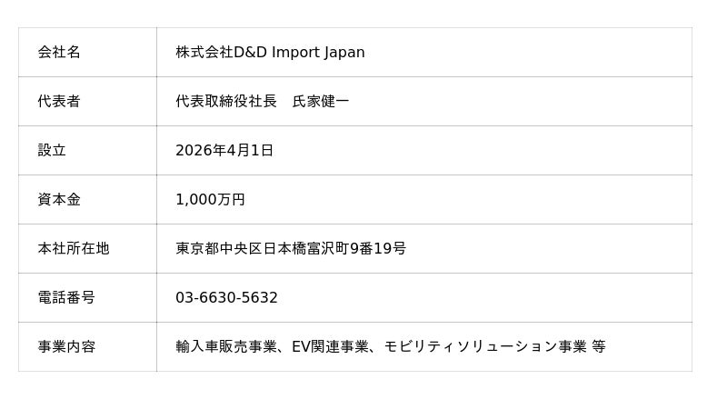 株式会社D&Dホールディングス(本社:東京都中央区、代表取締役社長:竹村 嘉規)は、輸入車事業の強化を目的として、2026年4月1日付で新会社 「株式会社D&D Import Japan」(本社:東京都中央区、代表取締役社長:氏家 健一)を設立いたしました。
