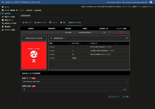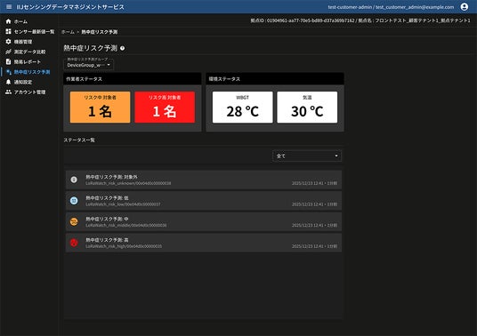 当社は、センサー機器によって取得したセンシングデータを活用して企業の業務改善および品質向上を支援する「IIJセンシングデータマネジメントサービス」において、WBGT(※1)センサーと心拍数を計測するウェアラブルセンサーを組み合わせて現場作業者の熱中症リスクを予測する、「熱中症リスク予測」機能を本日より提供開始いたします。
