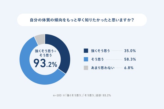 体質傾向を知って「もっと早く知りたかった」と思ったかを尋ねたところ、「強くそう思う」35.0%(36人)、「そう思う」58.3%(60人)となり、合計93.2%(96人)が肯定的に回答しました。