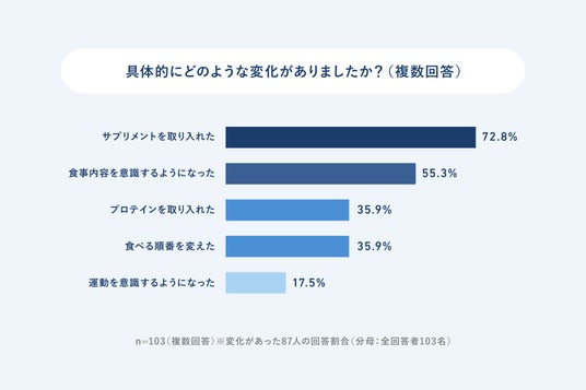変化の内容(複数回答):サプリメントを取り入れた 72.8%、食事内容を意識するようになった 55.3%
