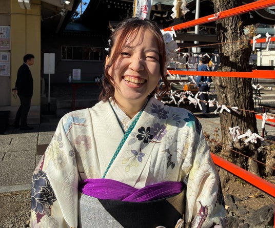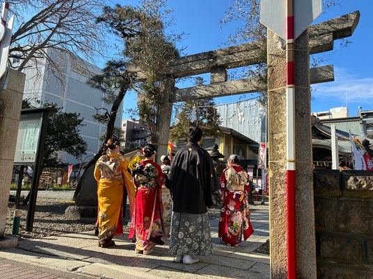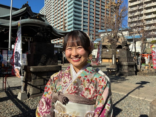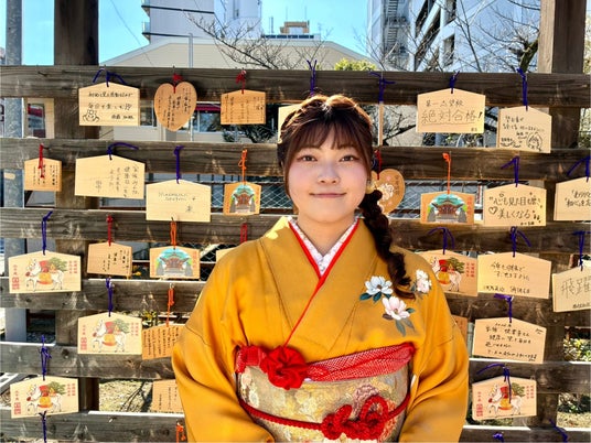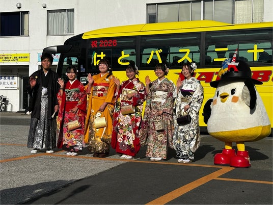 ~黄色いバスと振袖の共演~ 若手社員の門出を、東京のシンボル・はとバスが総出で祝福します。