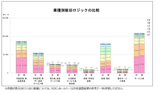 また、業種別の格付遷移状況においても、全ての業種において、A~D格企業が減少し、低格付企業が増加しました。業種別の低格付企業の増加としては、「サービス業」が最も多く、741件がA~D格からE・F格(旧78,743件/新79,484件)に格下げされています。(図表D)