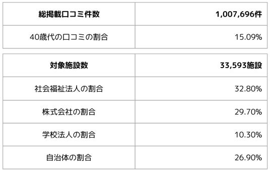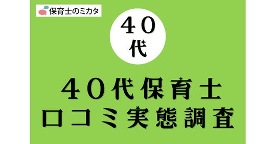 口コミ総掲載件数100万件の保育士職場口コミサイト『保育士のミカタ』は、40代の保育士が投稿した口コミ内容を分析し、保育園・幼稚園の職場のどんな点を評価をしていて、どんな点を評価していないのか40代保育士の実態調査を行いましたので、調査結果を公開いたします。