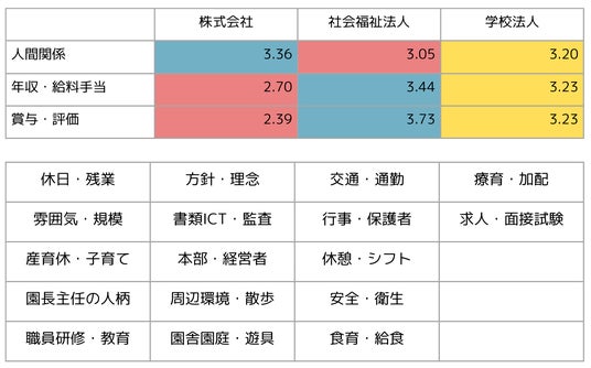 (人間関係、雰囲気・規模、年収・給料手当、賞与・評価、休日・残業、産育休・子育て、職員研修・教育、方針・理念、周辺環境・散歩、園舎園庭・遊具、交通・通勤、行事・保護者、書類ICT・監査、求人・面接試験、休憩・シフト、本部・経営者、安全・衛生、園長主任・運営、食育・給食、療育・加配)
