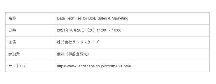 法人マスタデータを活用したDX実現を支援する株式会社ランドスケイプ(本社:東京都新宿区、代表取締役社長:長竹克仁、以下、ランドスケイプ)は、10月20日(水)に初のオンラインイベント「Data Tech Fes for BtoB Sales & Marketing」(参加無料)を開催します。